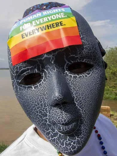 A masked Ugandan with a rainbow flag sticker showing the text ‘Human Rights For Everyone, Everywhere’ in white text.